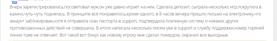 Справедливо будет заметить, что PokerDom, как и любой другой развивающийся оператор, имеет недостатки. Но важнее другое – как к этому относится администрация. В русскоязычном руме с этим все в порядке, разработчики оперативно реагируют на сигналы пользователей и устраняют выявленные минусы в работе.